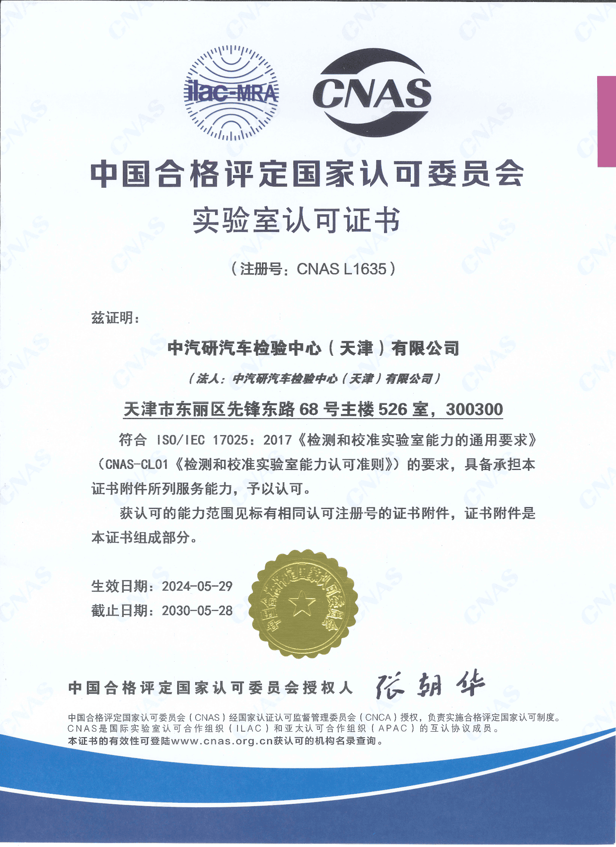 中汽研汽車檢驗中心(天津)有限公司(原天津汽車檢測中心,簡稱天津檢驗中心)始建于1987年,是由中國汽車技術研究中心有限公司(簡稱中汽中心)投資建立,是具有行業影響力的獨立第三方汽車產品檢測及技術服務機構,被國家認證認可監督管理委員會(CNCA)授權為國家轎車質量檢驗檢測中心、國家智能網聯汽車質量檢驗檢測中心(天津),已通過了國家認證認可監督管理委員會(CNCA)資質認定、中國合格評定國家認可委員會(CNAS)實驗室認可。